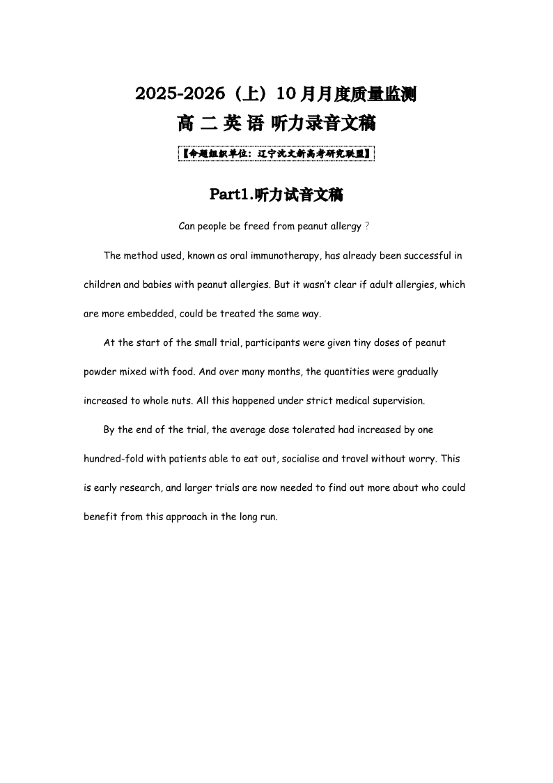 高二英语听力原文--辽宁省沈文新高考研究联盟2025-2026学年高二上学期10月质量监测