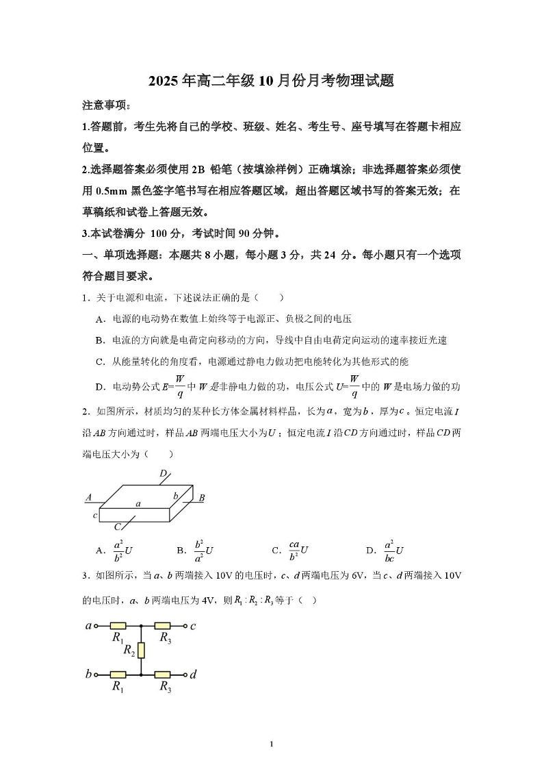 高二物理--山东省济宁市第一中学2025-2026学年高二上学期10月月考