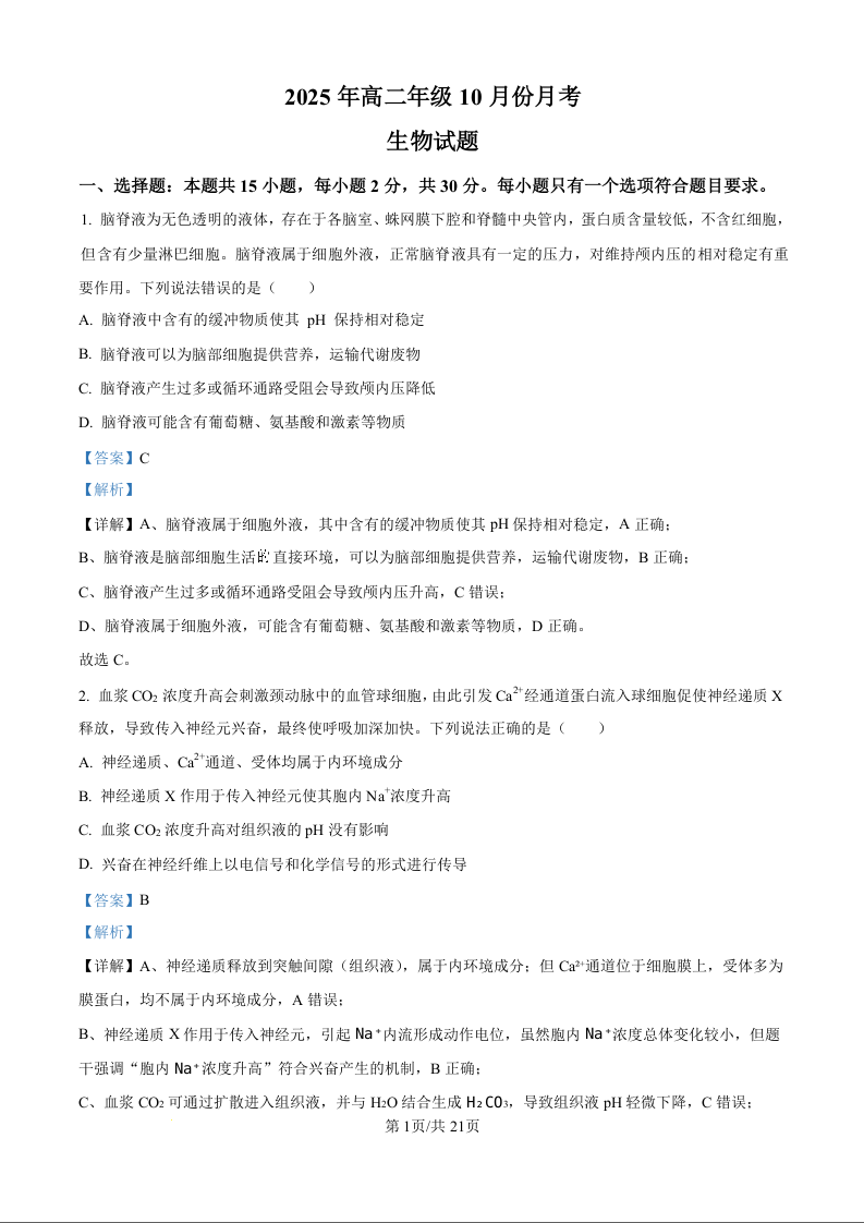 高二生物(精品解析版)--山东省济宁市第一中学2025-2026学年高二上学期10月月考
