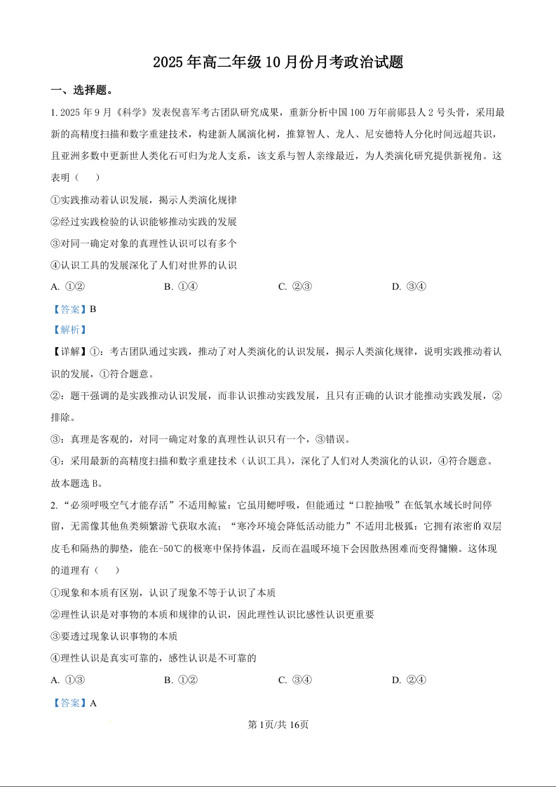 高二政治(精品解析版)--山东省济宁市第一中学2025-2026学年高二上学期10月月考
