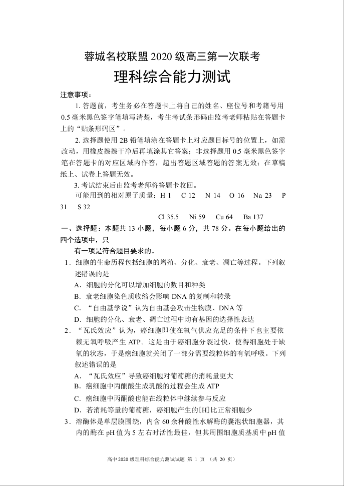 高三理综--四川省成都市蓉城名校联盟2022-2023学年高三上学期第一次联考