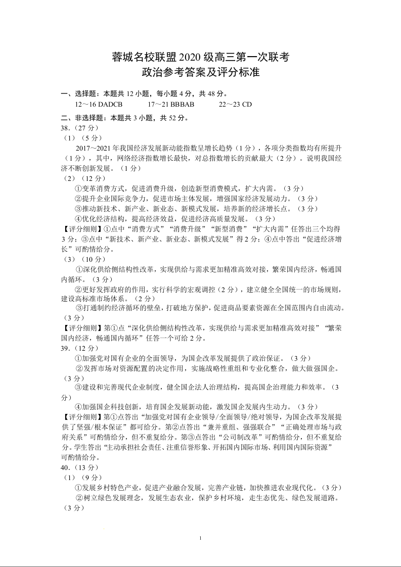 高三文综政治答案--四川省成都市蓉城名校联盟2022-2023学年高三上学期第一次联考
