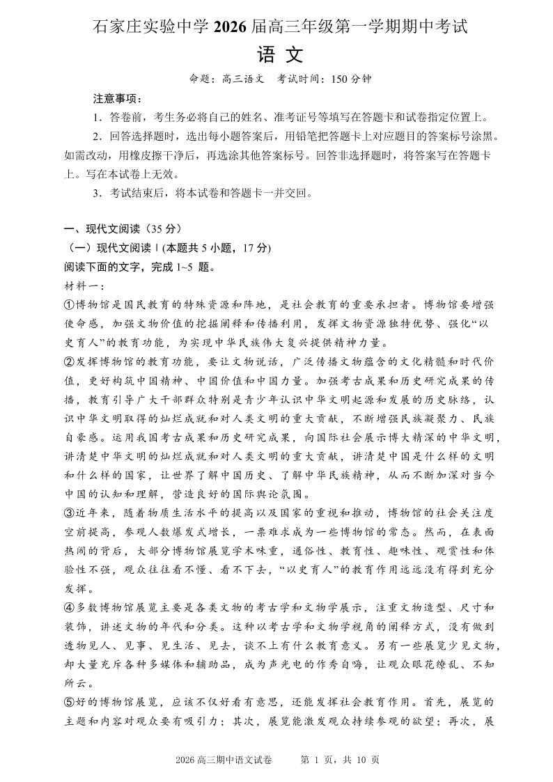 高三语文--河北省石家庄实验中学2026届高三年级第一学期期中考试