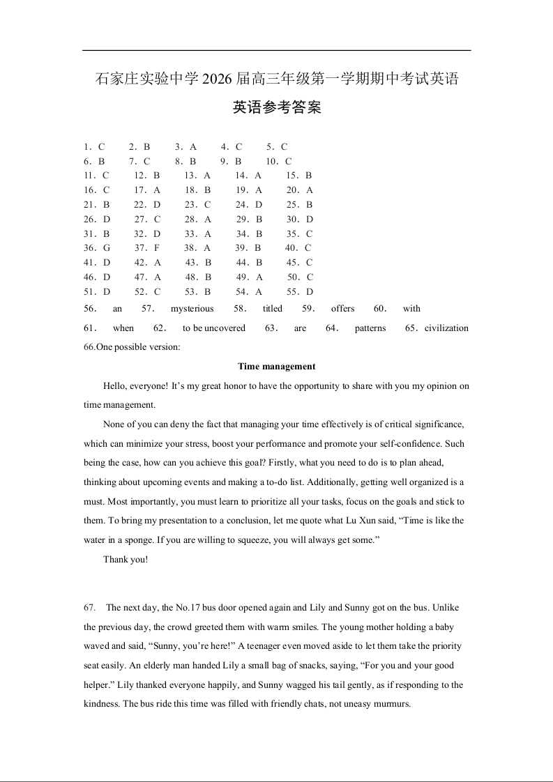 高三英语答案--河北省石家庄实验中学2026届高三年级第一学期期中考试