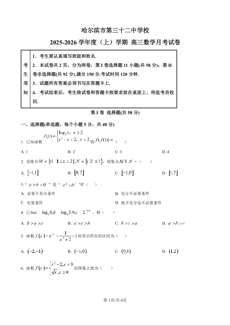 高三数学(原卷版)--黑龙江省哈尔滨市第三十二中学校2026届高三上学期10月月考