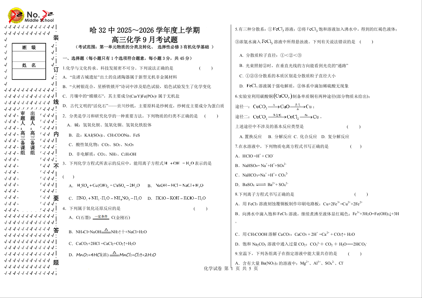 高三化学+答案--黑龙江省哈尔滨市第三十二中学校2026届高三上学期10月月考
