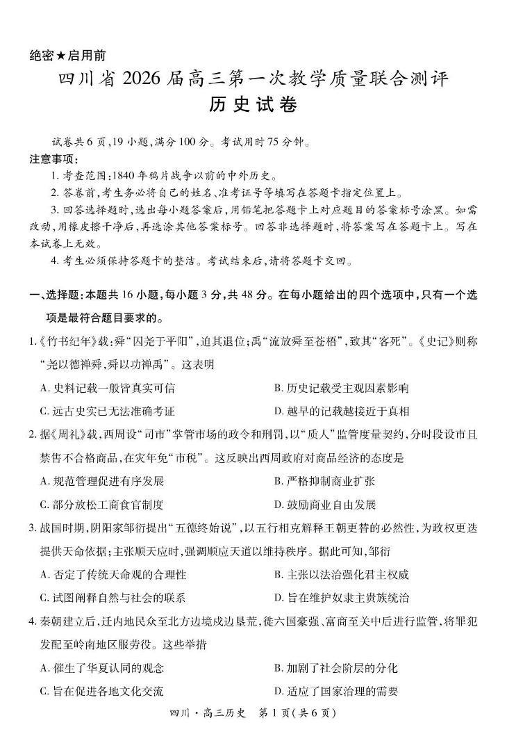 高三历史--四川省大数据智学领航联盟2026届高三第一次教学质量联合测评