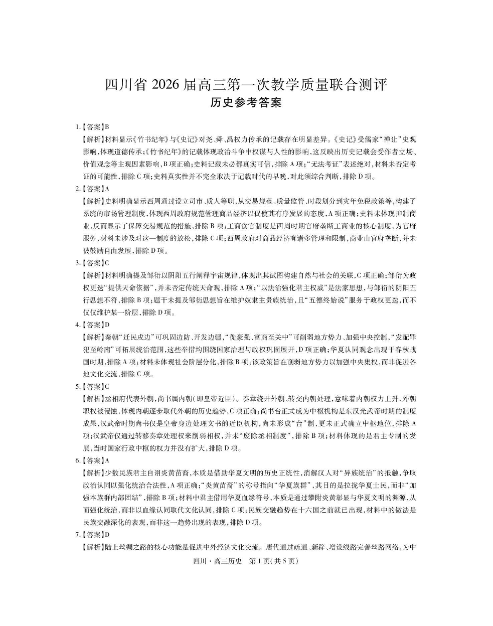 高三历史答案--四川省大数据智学领航联盟2026届高三第一次教学质量联合测评