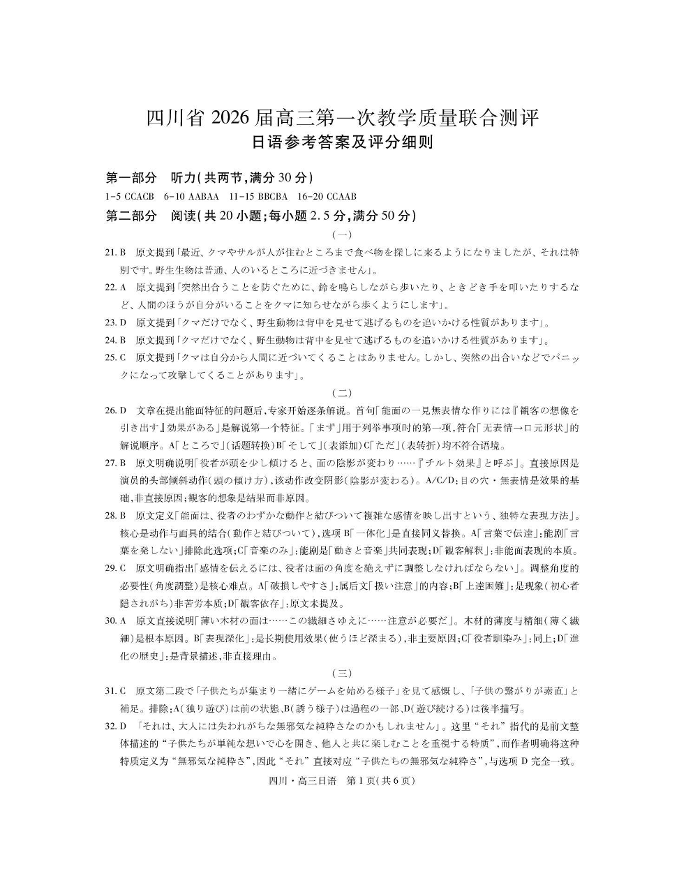 高三日语答案--四川省大数据智学领航联盟2026届高三第一次教学质量联合测评