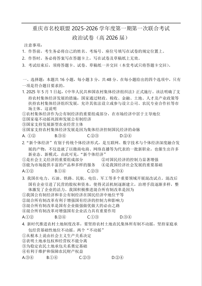 高三政治+答案--重庆市名校联盟2026届高三上学期第一次联合考试