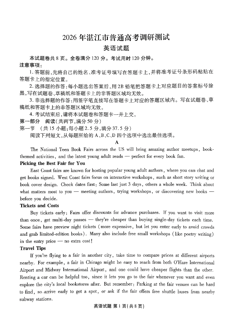 高三英语--广东省湛江市2026届高三普通高考10月调研测试