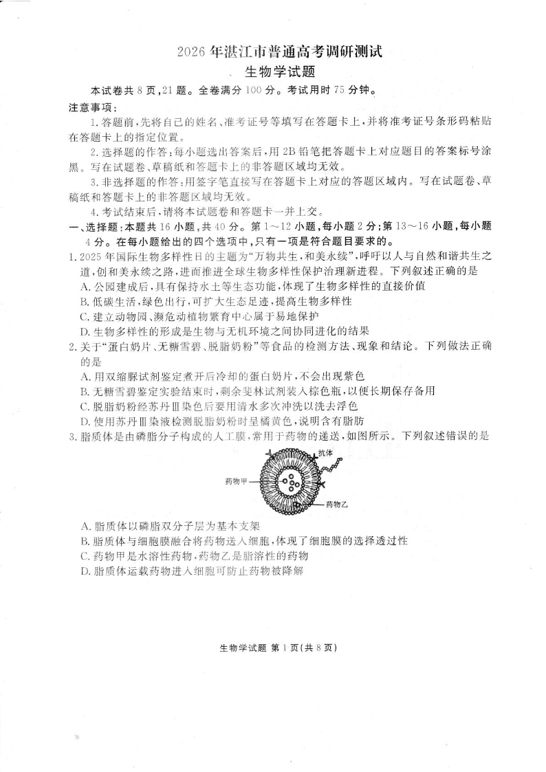 高三生物--广东省湛江市2026届高三普通高考10月调研测试