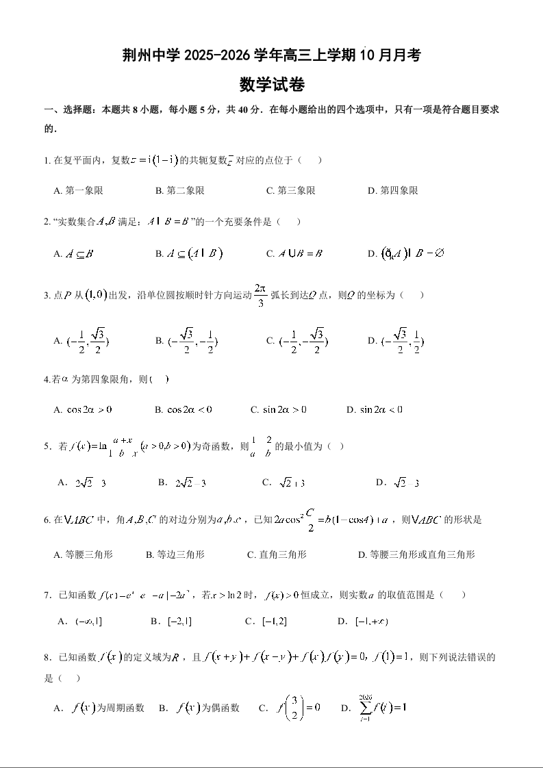 高三数学--湖北省荆州中学2026届高三上学期10月月考