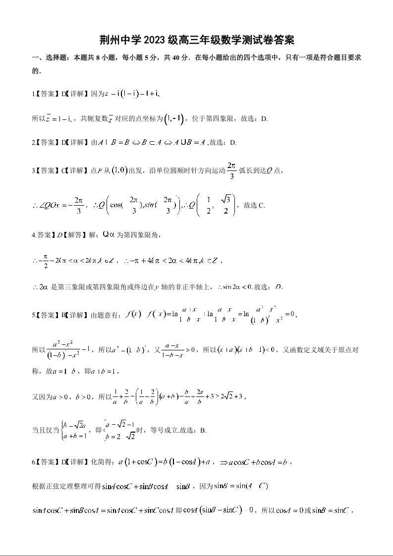 高三数学答案--湖北省荆州中学2026届高三上学期10月月考