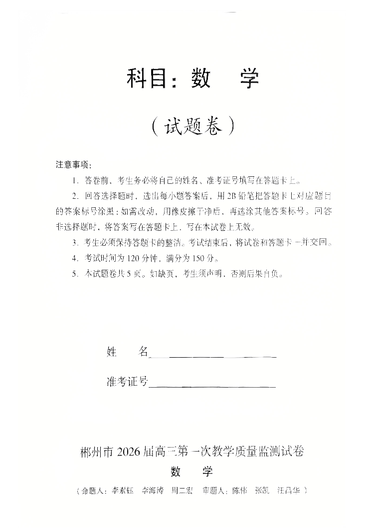 高三数学+答案--湖南省郴州市2026届高三上学期第一次教学质量监测