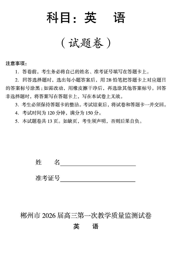高三英语--湖南省郴州市2026届高三上学期第一次教学质量监测