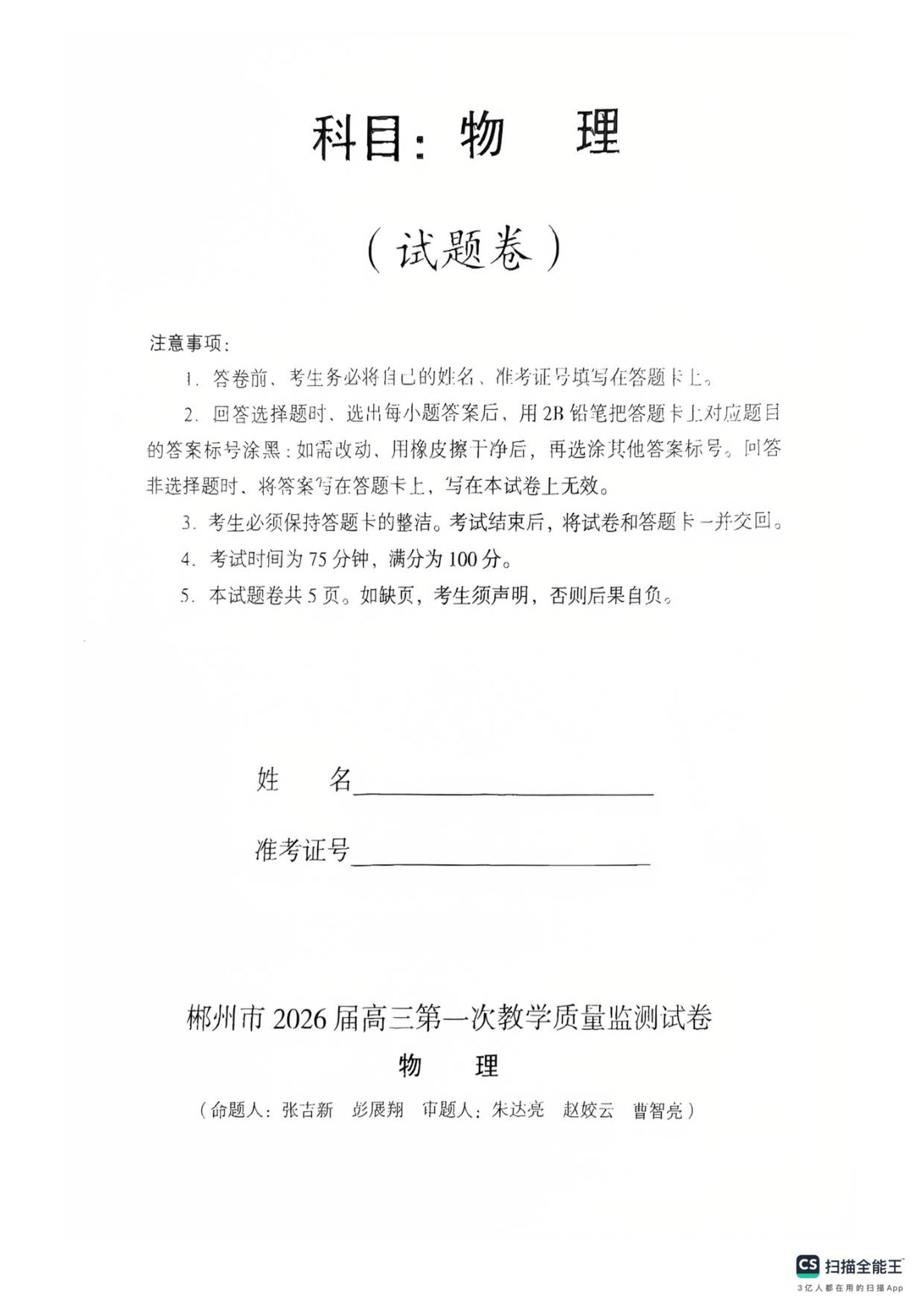 高三物理--湖南省郴州市2026届高三上学期第一次教学质量监测