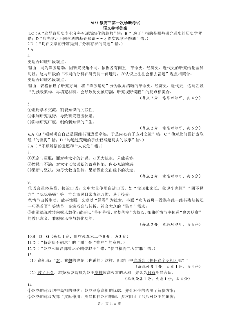 高三语文答案--四川省绵阳市高中2023级第一次诊断性考试