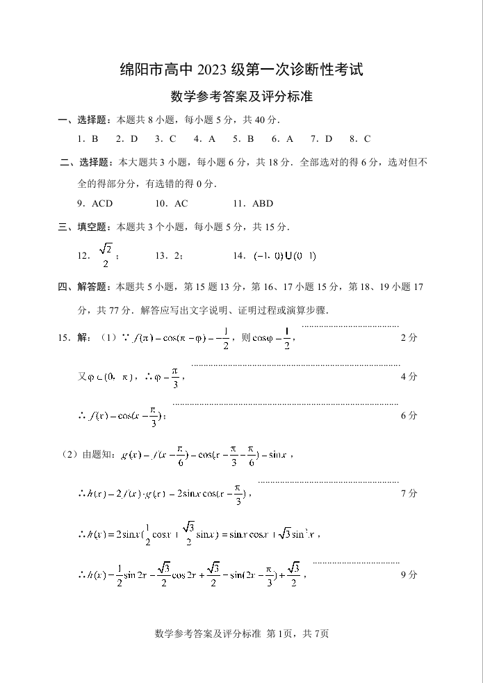高三数学答案--四川省绵阳市高中2023级第一次诊断性考试