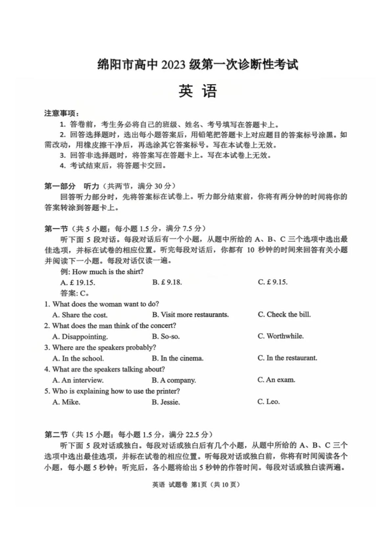 高三英语--四川省绵阳市高中2023级第一次诊断性考试