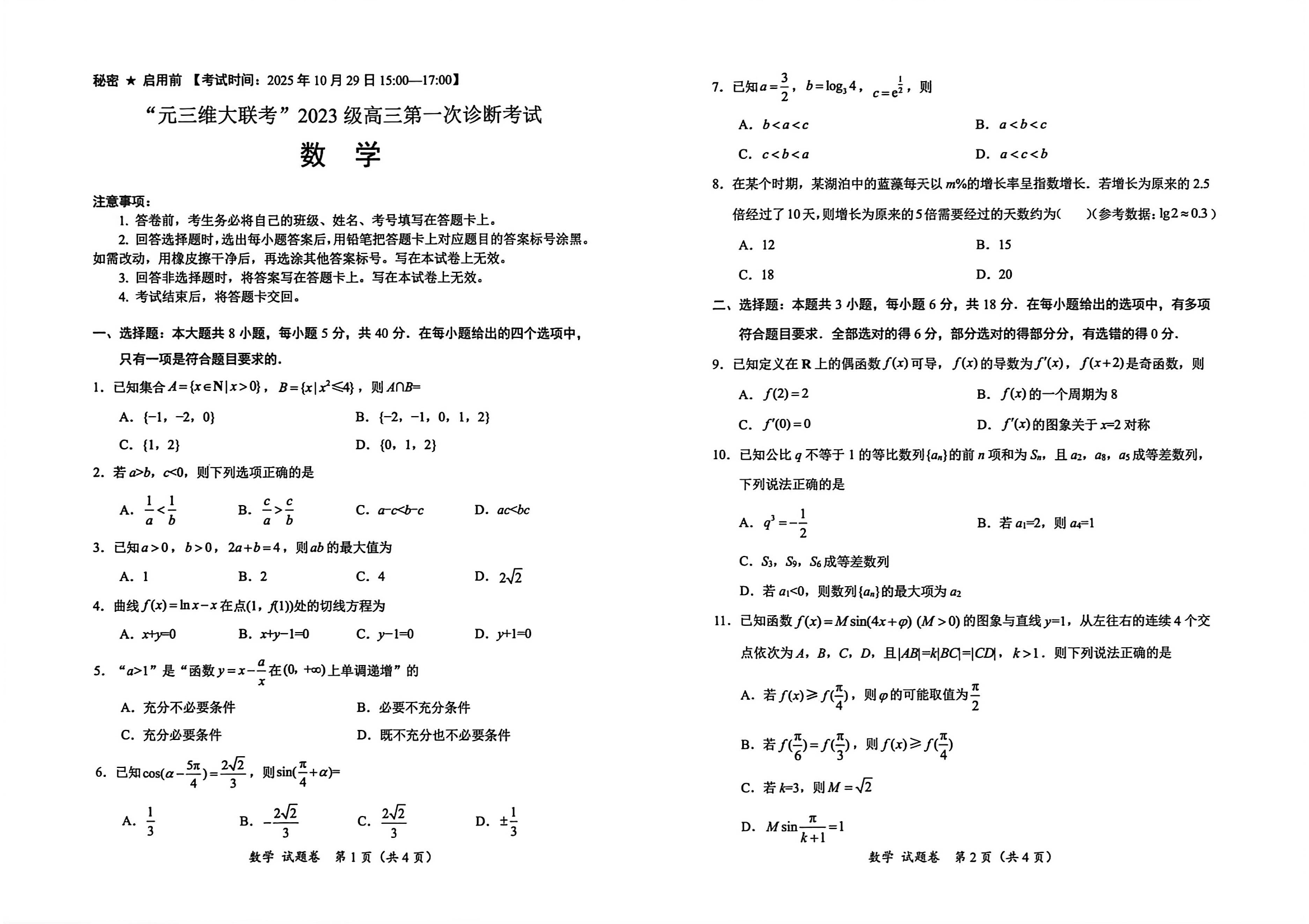 高三数学--四川省元三维大联考2023级高三第一次诊断考试