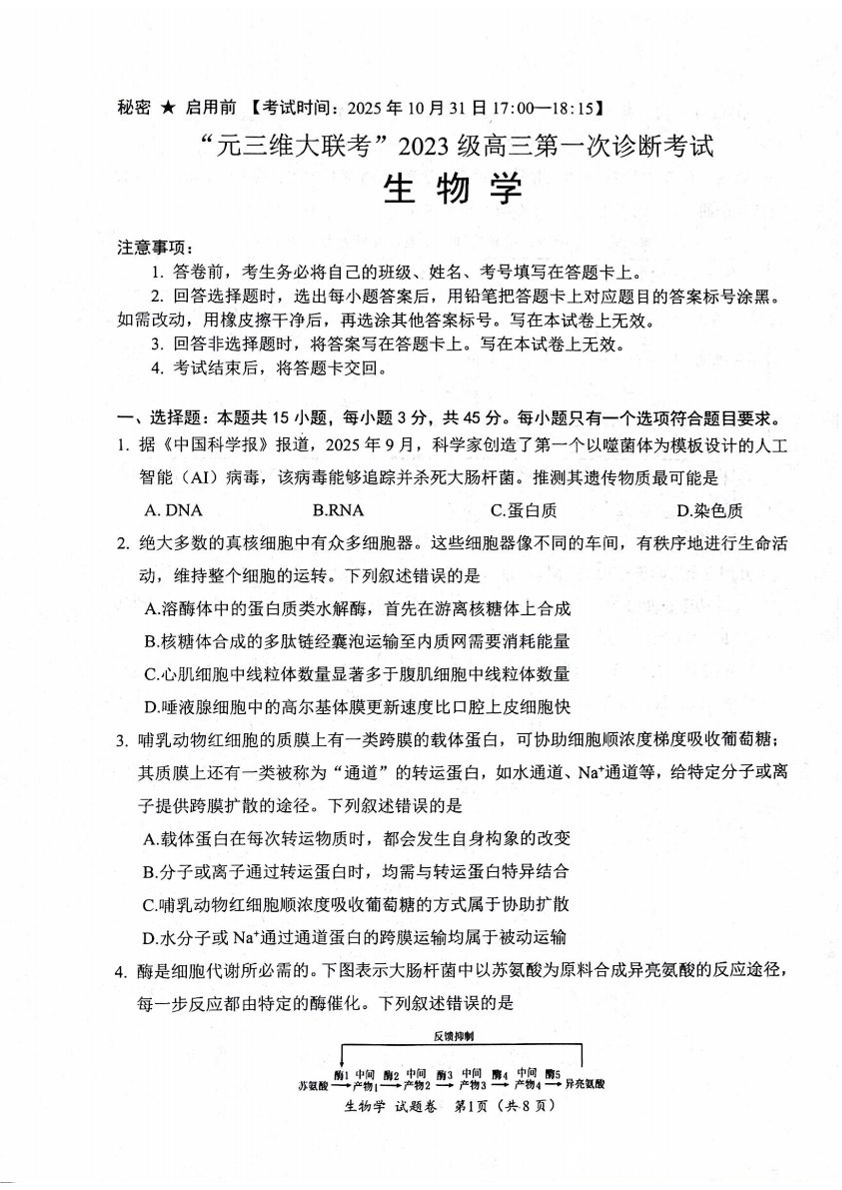 高三生物--四川省元三维大联考2023级高三第一次诊断考试