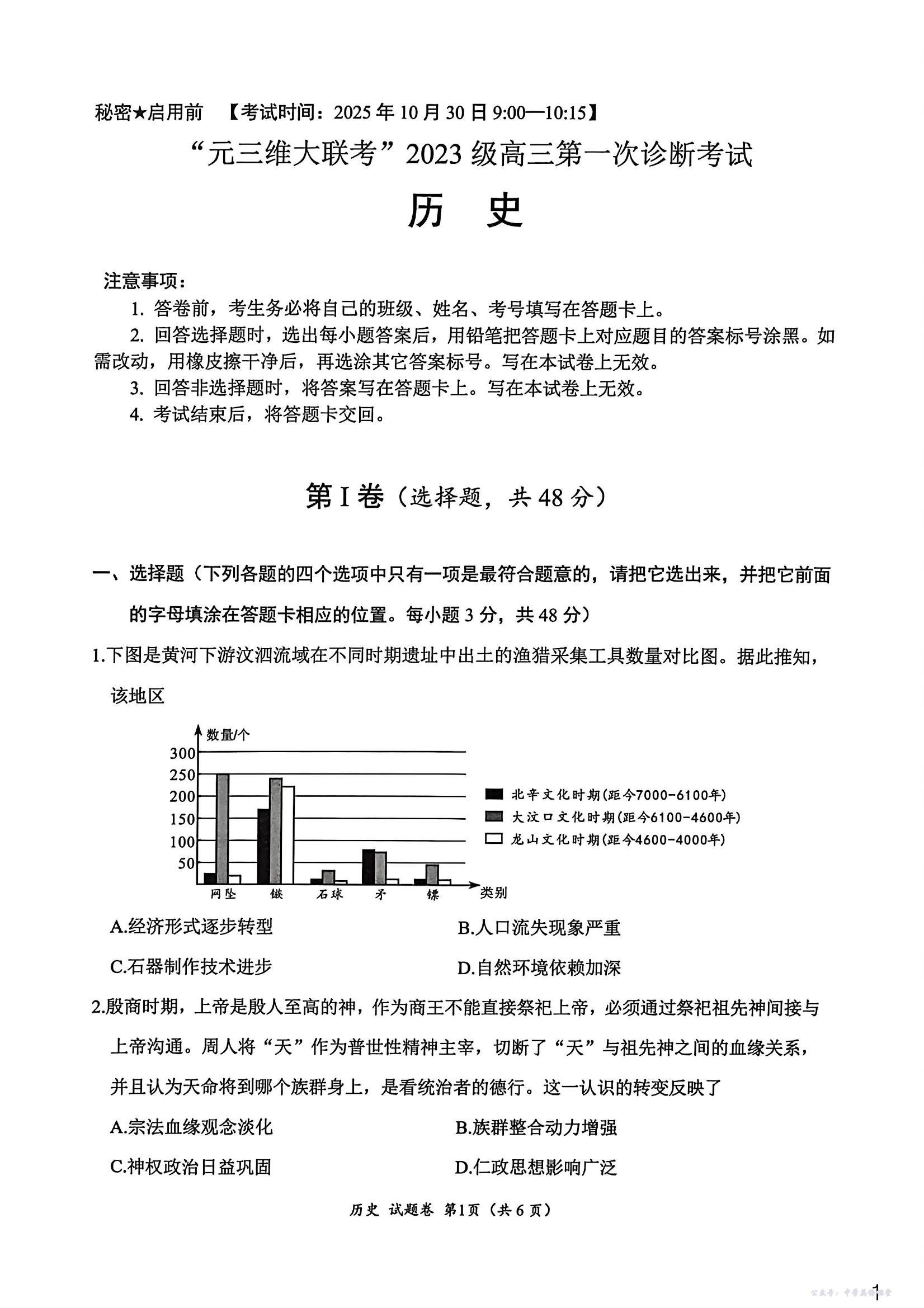高三历史--四川省元三维大联考2023级高三第一次诊断考试