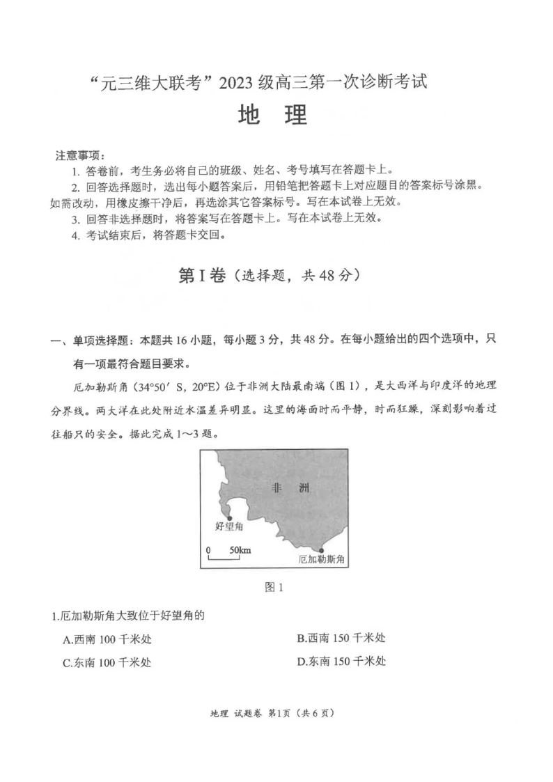 高三地理+答案--四川省元三维大联考2023级高三第一次诊断考试