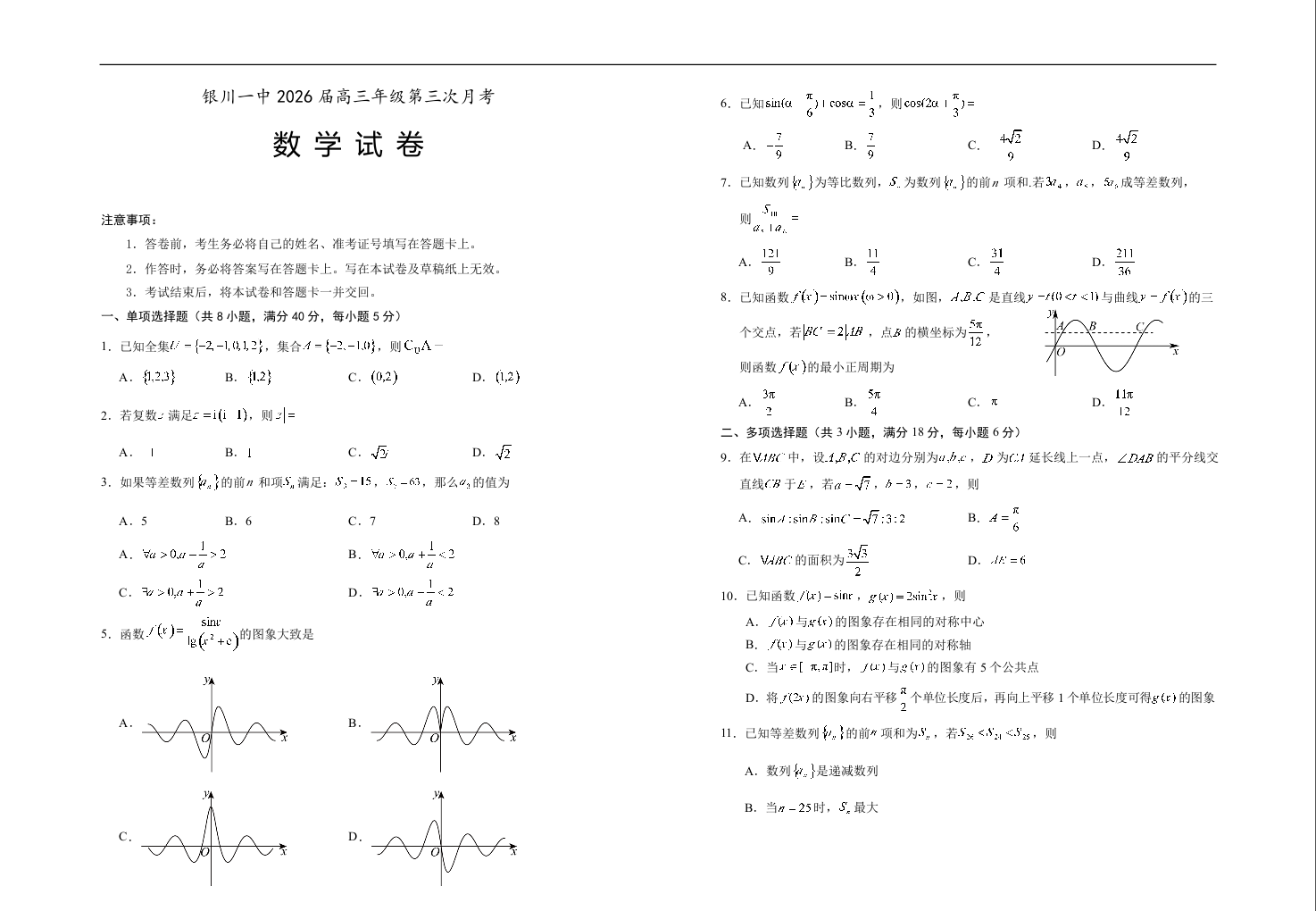 高三数学--宁夏回族自治区银川一中2026届高三年级第三次月考