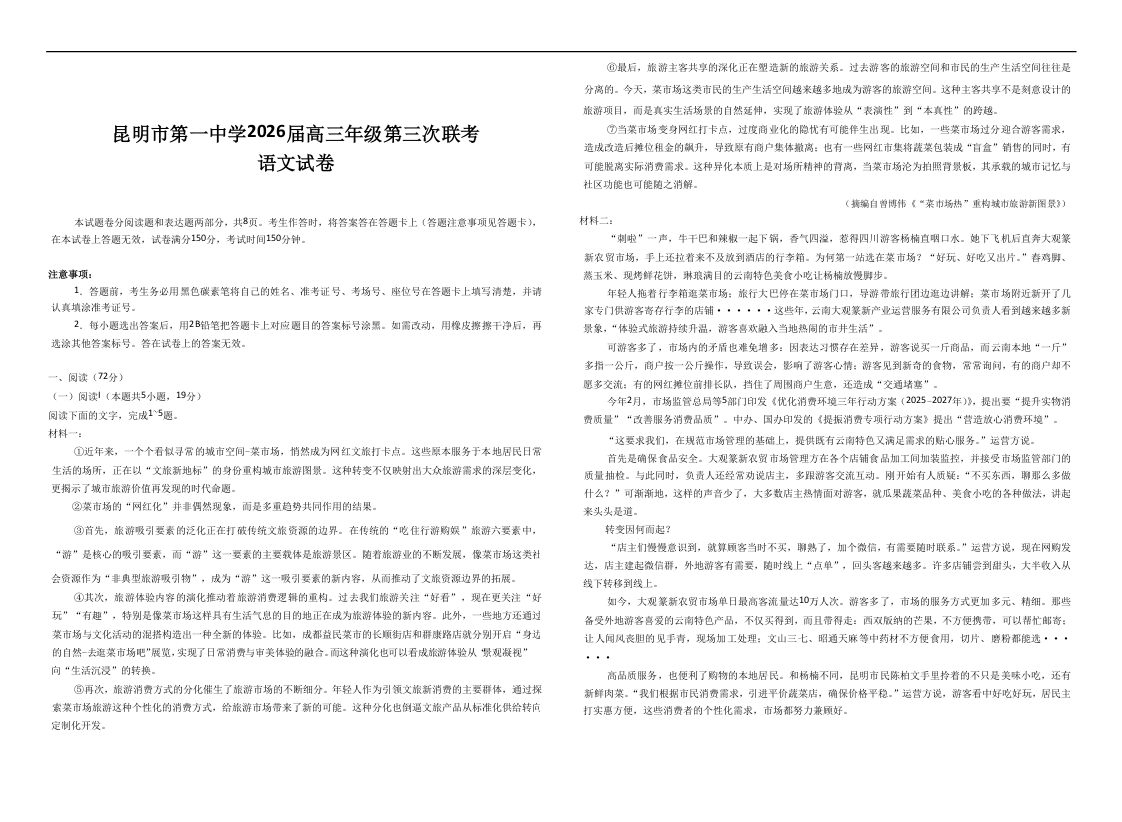 高三语文--云南省昆明市第一中学2026届高三上学期第三次联考