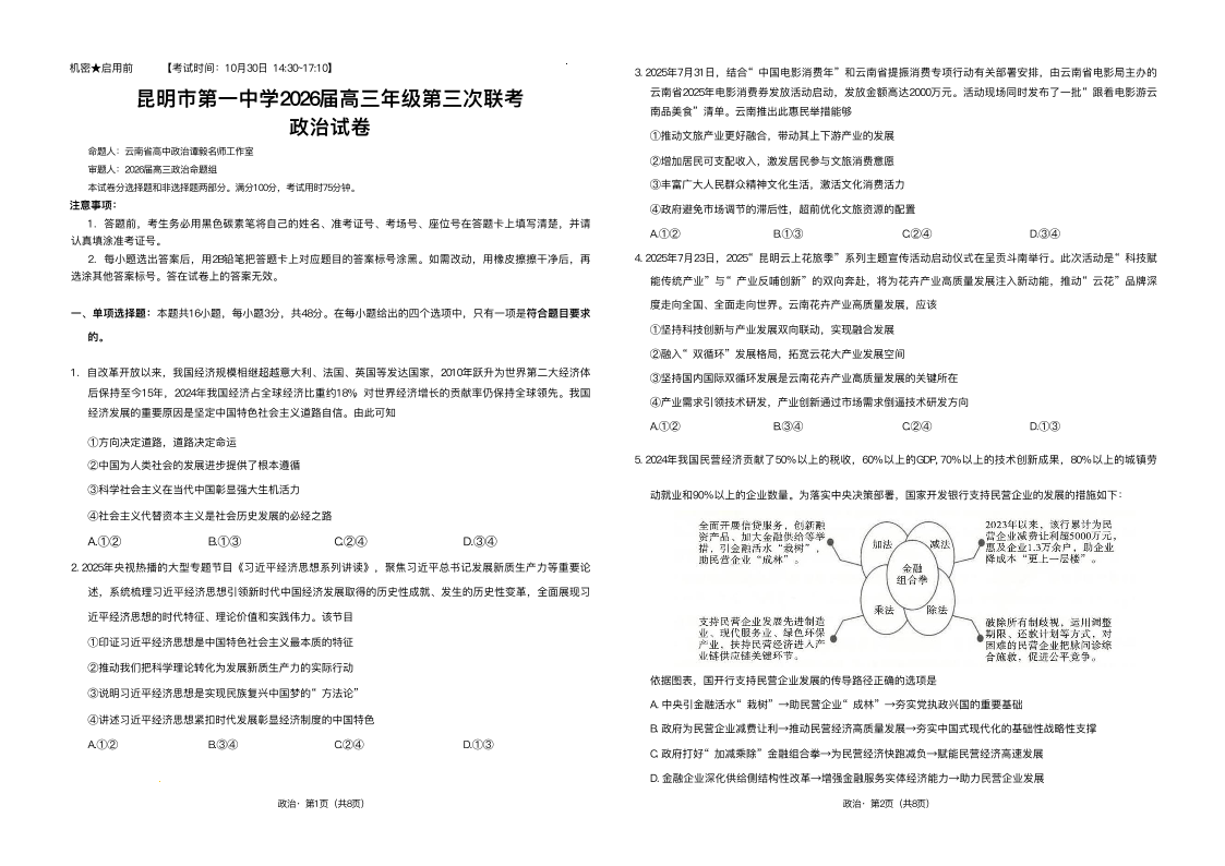 高三政治+答案--云南省昆明市第一中学2026届高三上学期第三次联考