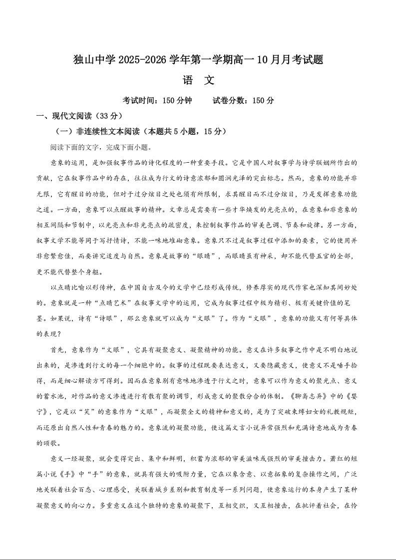 高一语文+答案--安徽省六安市独山中学2025-2026学年高一上学期10月月考