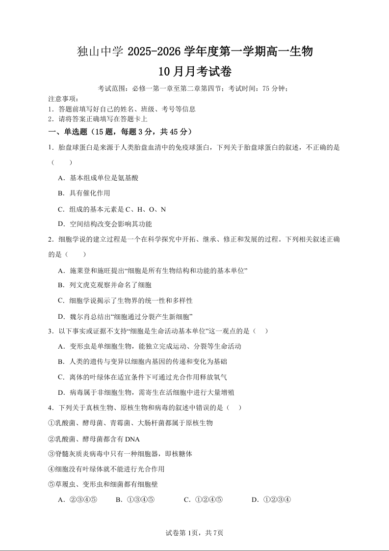 高一生物+答案--安徽省六安市独山中学2025-2026学年高一上学期10月月考
