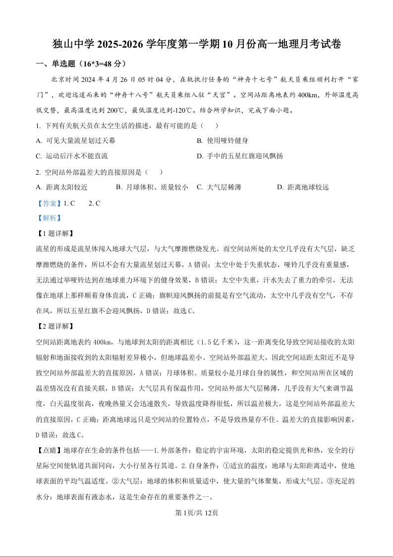 高一地理(精品解析版)--安徽省六安市独山中学2025-2026学年高一上学期10月月考