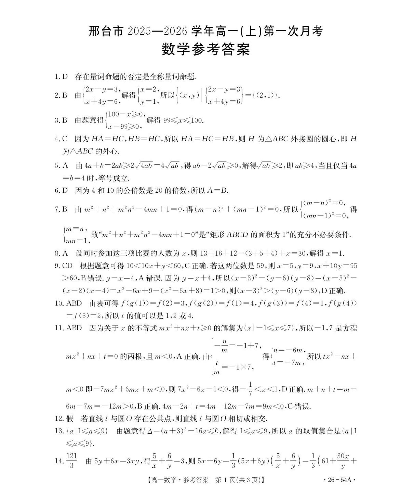 高一数学答案--河北省邢台市2025-2026学年高一上学期10月第一次月考