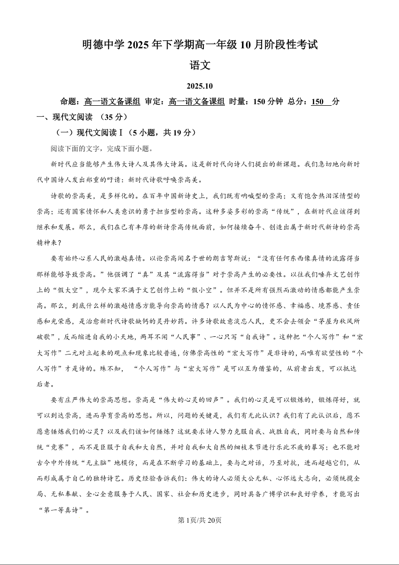 高一语文(精品解析版)--湖南省长沙市明德中学2025-2026学年高一上学期10月月考