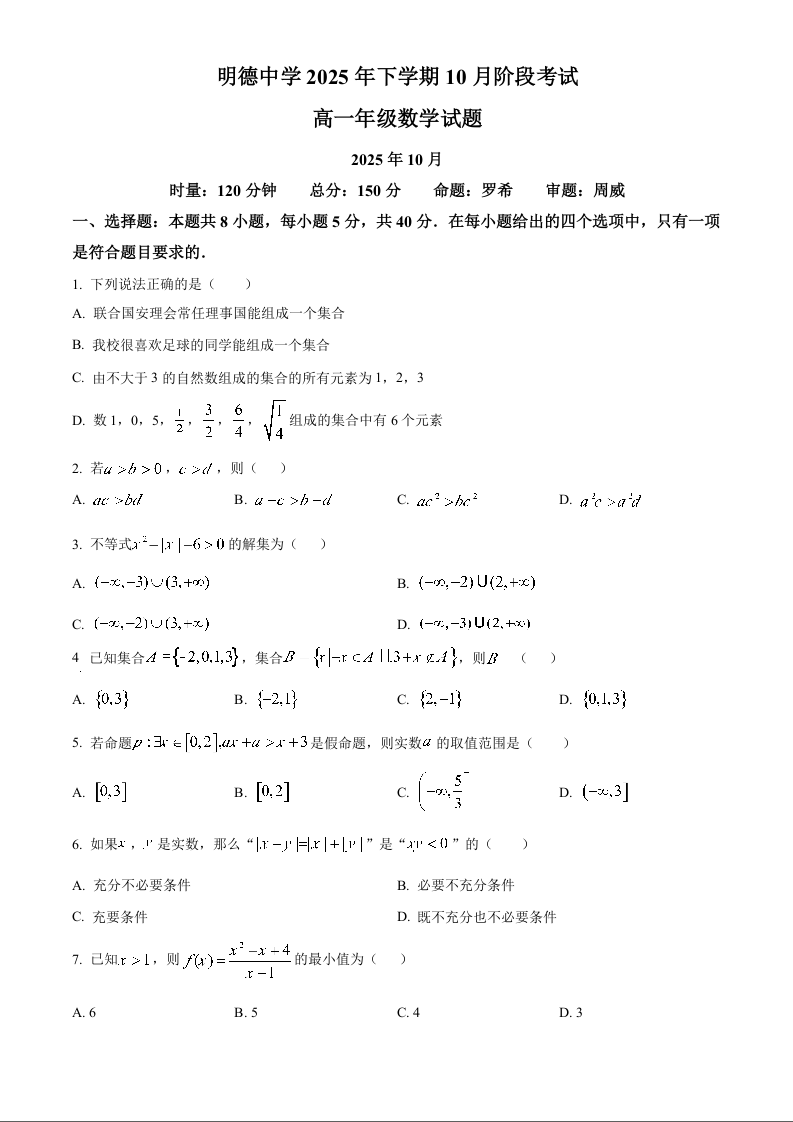高一数学(原卷版)--湖南省长沙市明德中学2025-2026学年高一上学期10月月考