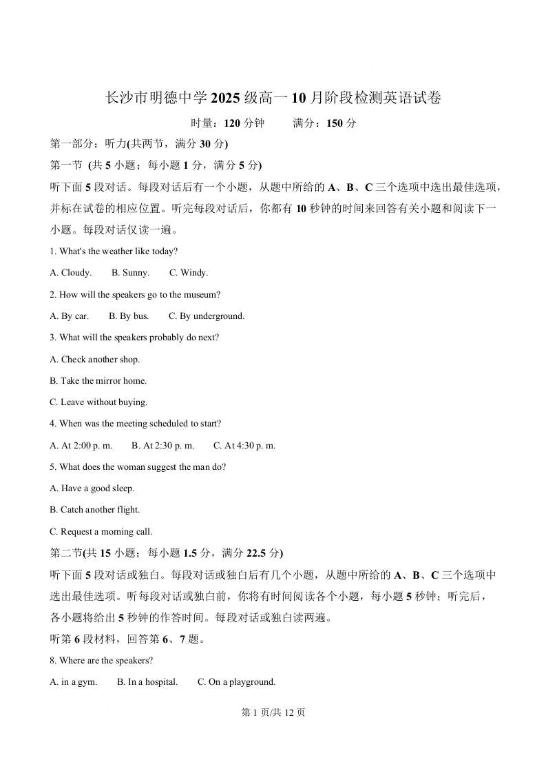 高一英语(原卷版)--湖南省长沙市明德中学2025-2026学年高一上学期10月月考