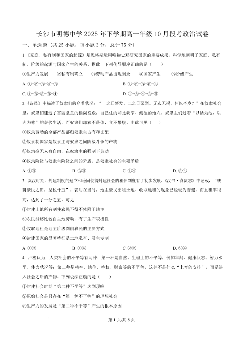 高一政治(原卷版)--湖南省长沙市明德中学2025-2026学年高一上学期10月月考
