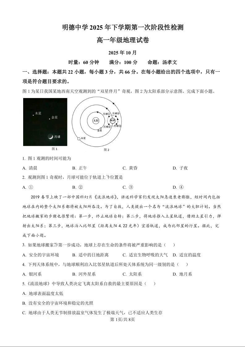 高一地理(原卷版)--湖南省长沙市明德中学2025-2026学年高一上学期10月月考