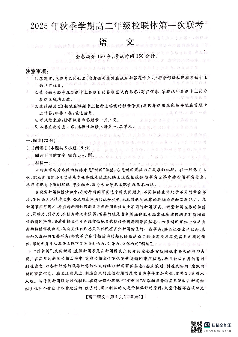 高二语文+答案--广西壮族自治区河池市十校联考2025-2026学年高二上学期10月月考