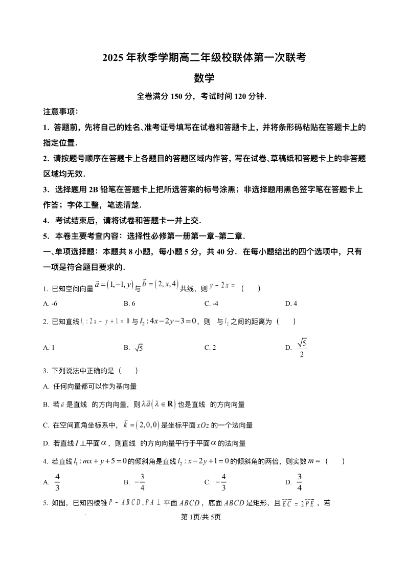 高二数学+答案--广西壮族自治区河池市十校联考2025-2026学年高二上学期10月月考