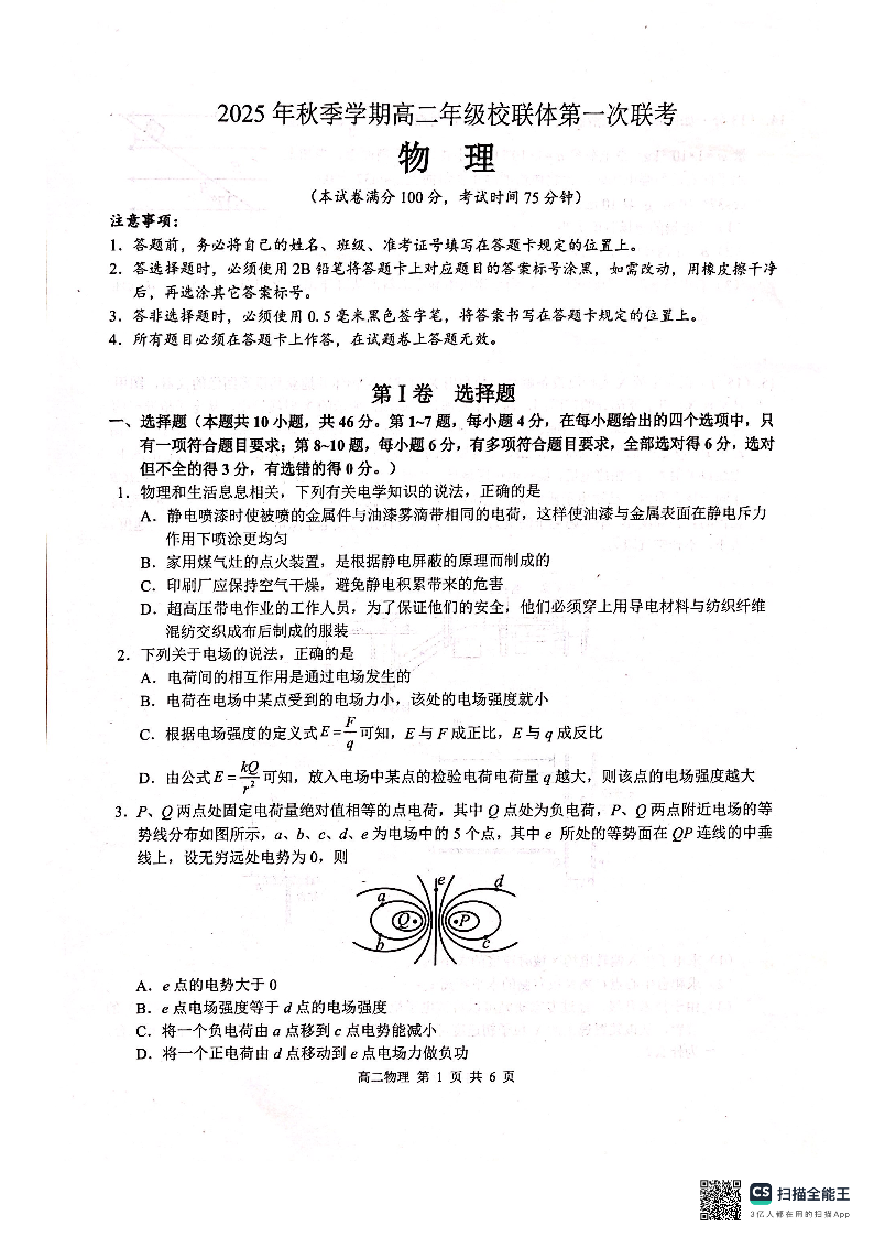 高二物理+答案--广西壮族自治区河池市十校联考2025-2026学年高二上学期10月月考
