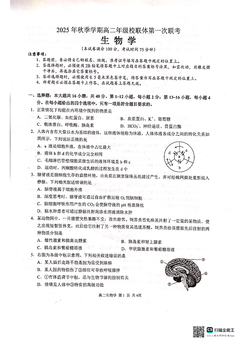 高二生物--广西壮族自治区河池市十校联考2025-2026学年高二上学期10月月考