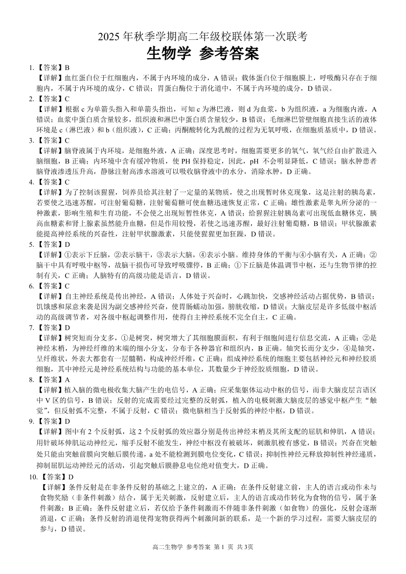 高二生物答案--广西壮族自治区河池市十校联考2025-2026学年高二上学期10月月考