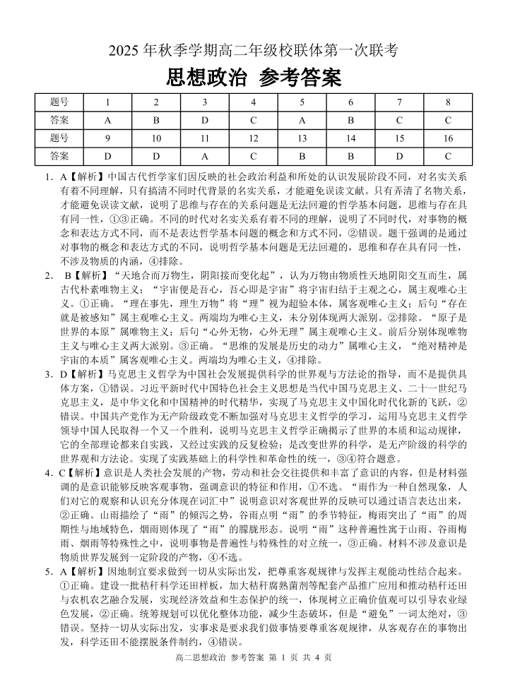 高二政治答案--广西壮族自治区河池市十校联考2025-2026学年高二上学期10月月考
