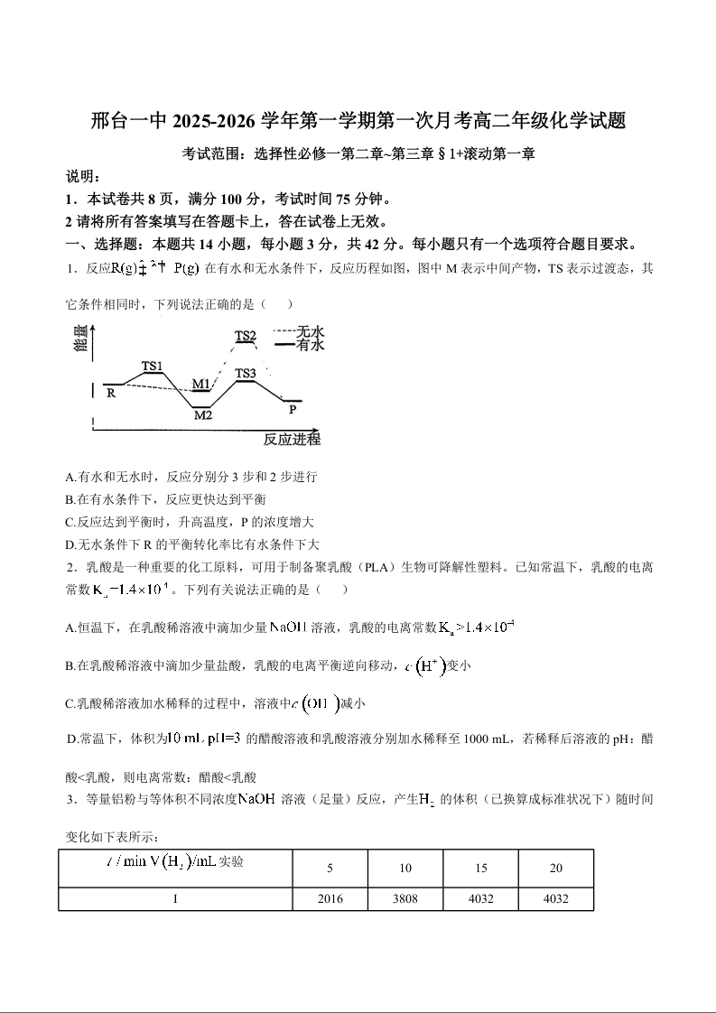 高二化学+答案--河北省邢台市第一中学2025-2026学年高二上学期10月第一次月考