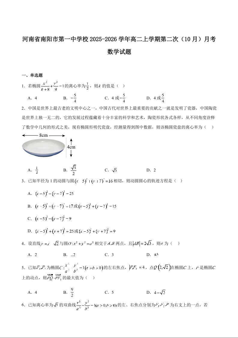 高二数学+答案--河南省南阳市第一中学2025-2026学年高二上学期10月第二次月考