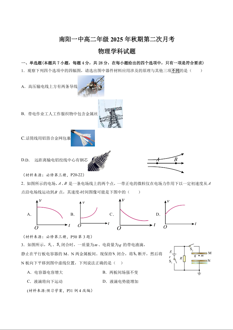 高二物理+答案--河南省南阳市第一中学2025-2026学年高二上学期10月第二次月考