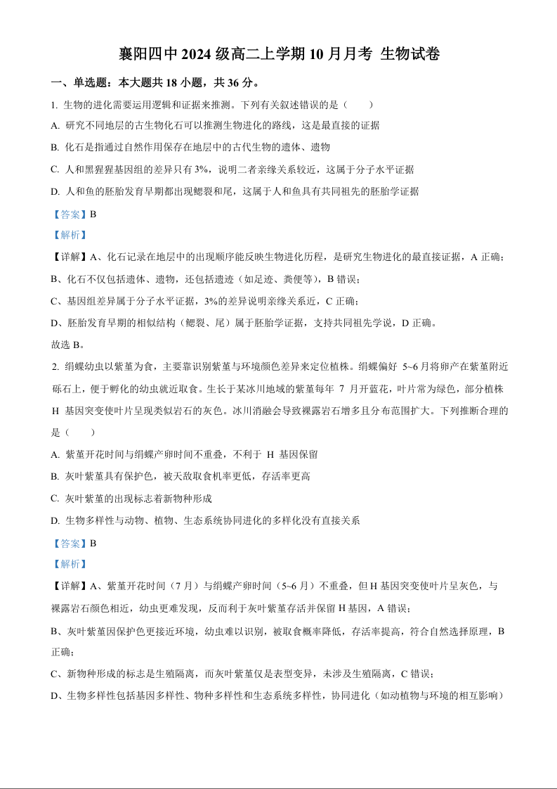 高二生物(解析版)--湖北省襄阳市第四中学2025-2026学年高二上学期10月月考